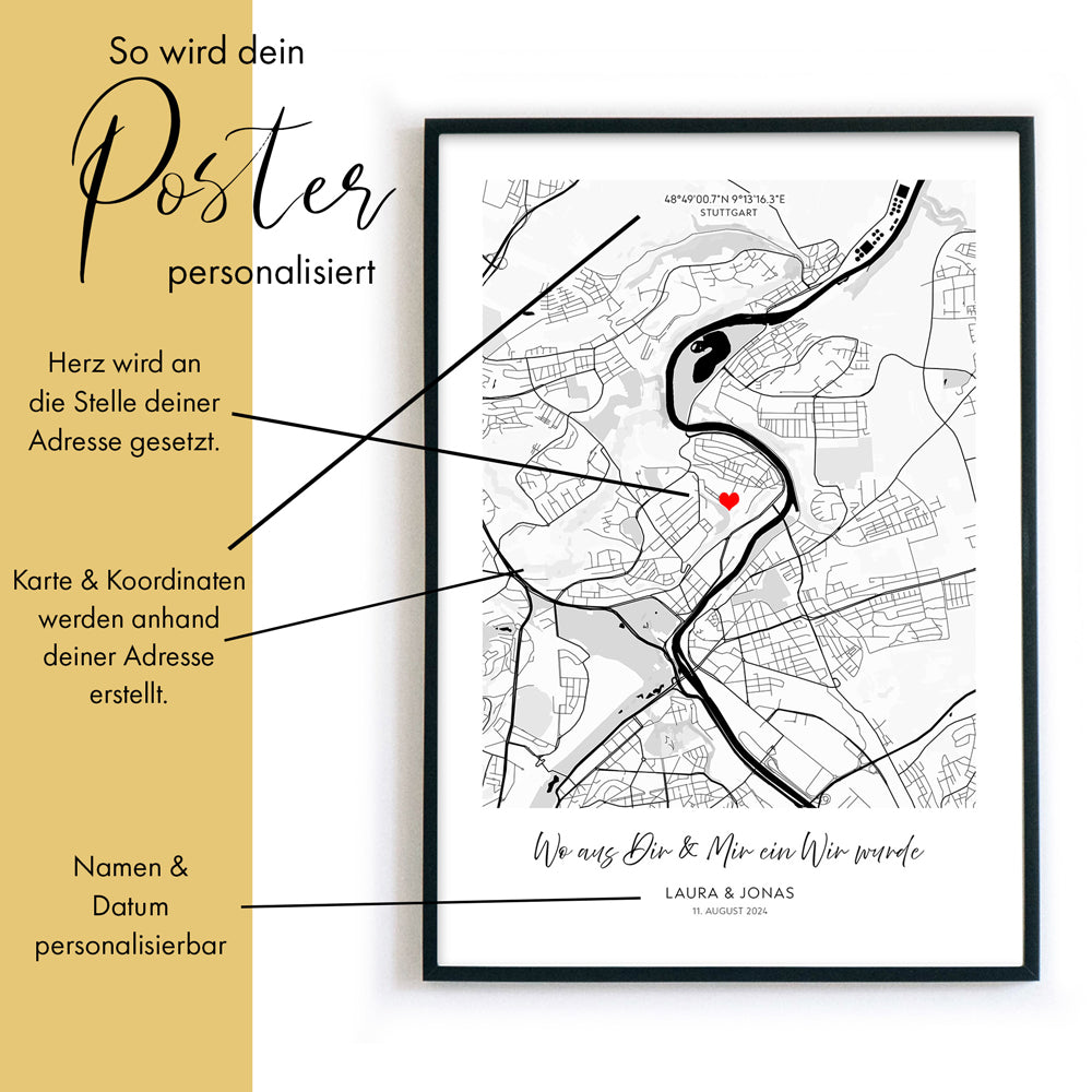 Zeigen Sie Ihre Liebe mit einem personalisierten Stadt-Karten Poster! Geben Sie Ihre Namen, ein wichtiges Datum und Koordinaten an, um Ihr einzigartiges Wir zu symbolisieren. Das perfekte Geschenk zur Hochzeit oder zum Jahrestag, um die gemeinsame Reise Ihrer Liebe zu feiern.